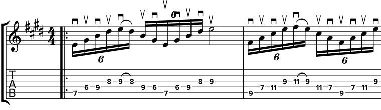 | Ejercicio con cambio de cuerda a púa y contrapúa a tres cuerdas con tresillos |
