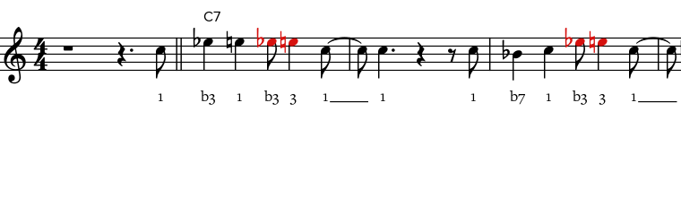I'm using 7 techniques (steps) here, each of which I demonstrate in an example chorus (1 blues form). If new elements are added to a technique, these are marked in red. In addition, each note's function is labeled.
