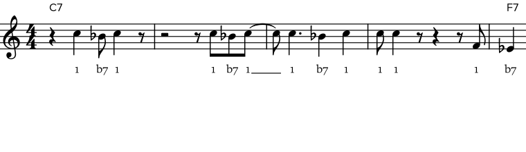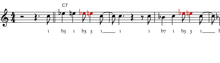 I'm using 7 techniques (steps) here, each of which I demonstrate in an example chorus (1 blues form). If new elements are added to a technique, these are marked in red. In addition, each note's function is labeled.