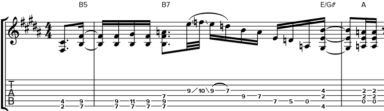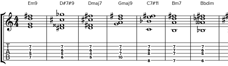 The chords could be the best part. Mark uses wacky voicings and slash chords that make the parent chord sound completely new, and many passages use chords that have been rhythmically broken apart into intervals across the neck.