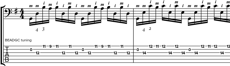 Besides standard notation and the corresponding tabulature you will find detailed fingerings for both, the left and the right hand.