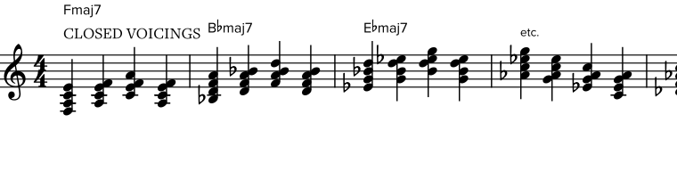 In every bar you will find four chords, moving through the different inversions of the selected chord type. The direction (ascending or descending) depends on the available range on the instrument. The goal is to internalize this movement pattern, allowing you to shift voicings upward or downward freely, based on musical and technical needs, while avoiding the limitations of the instrument's range.