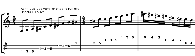 10 weeks of warm-up exercises, scales, scale sequences, modes, arpeggios, chords, rhythmic motifs, practical theory applications, licks, triad pairs and more. All broken down into weekly segments that start slow and gradually push the tempo each week. Every time you repeat each practice session you can up the tempo futhering your technical prowess.